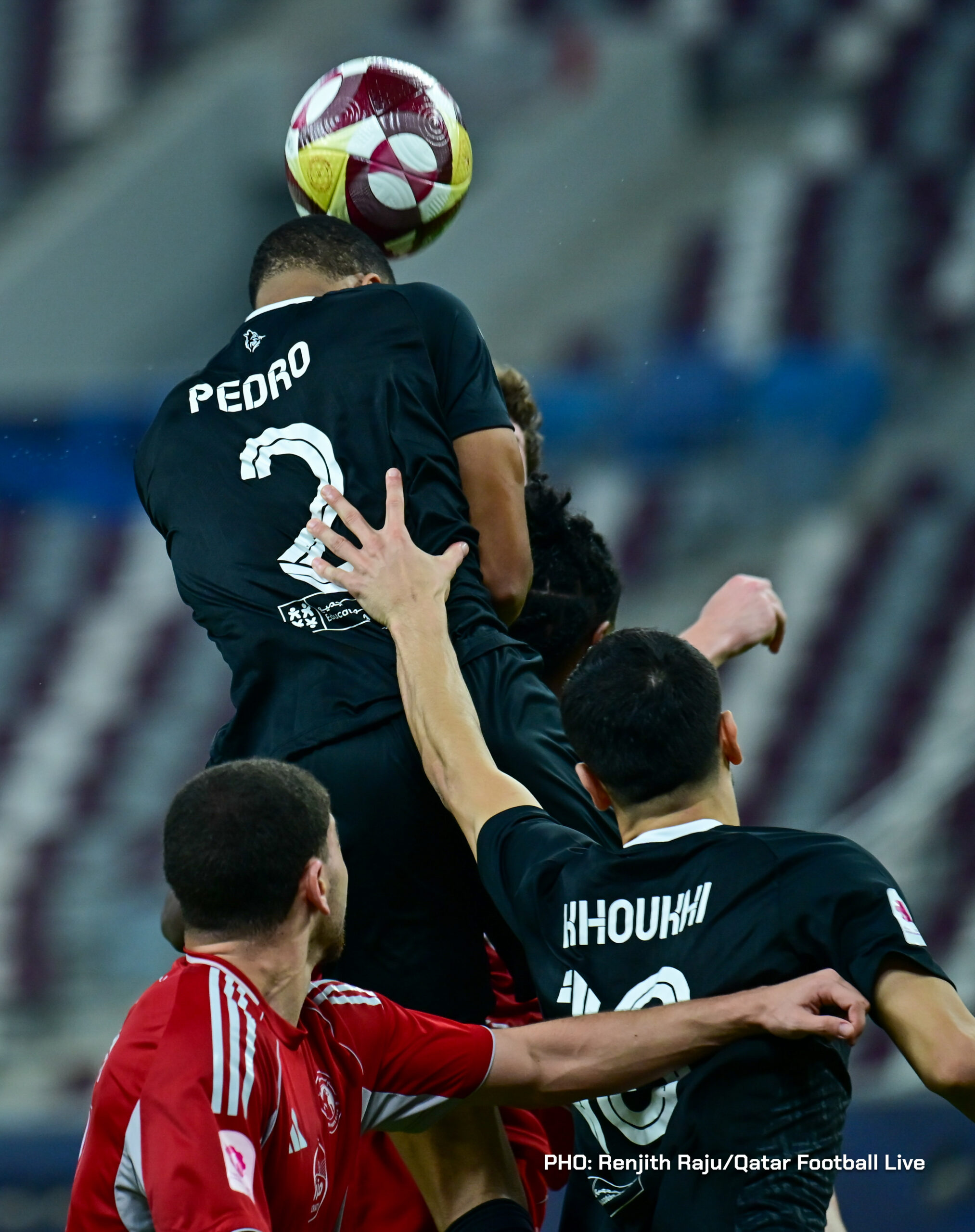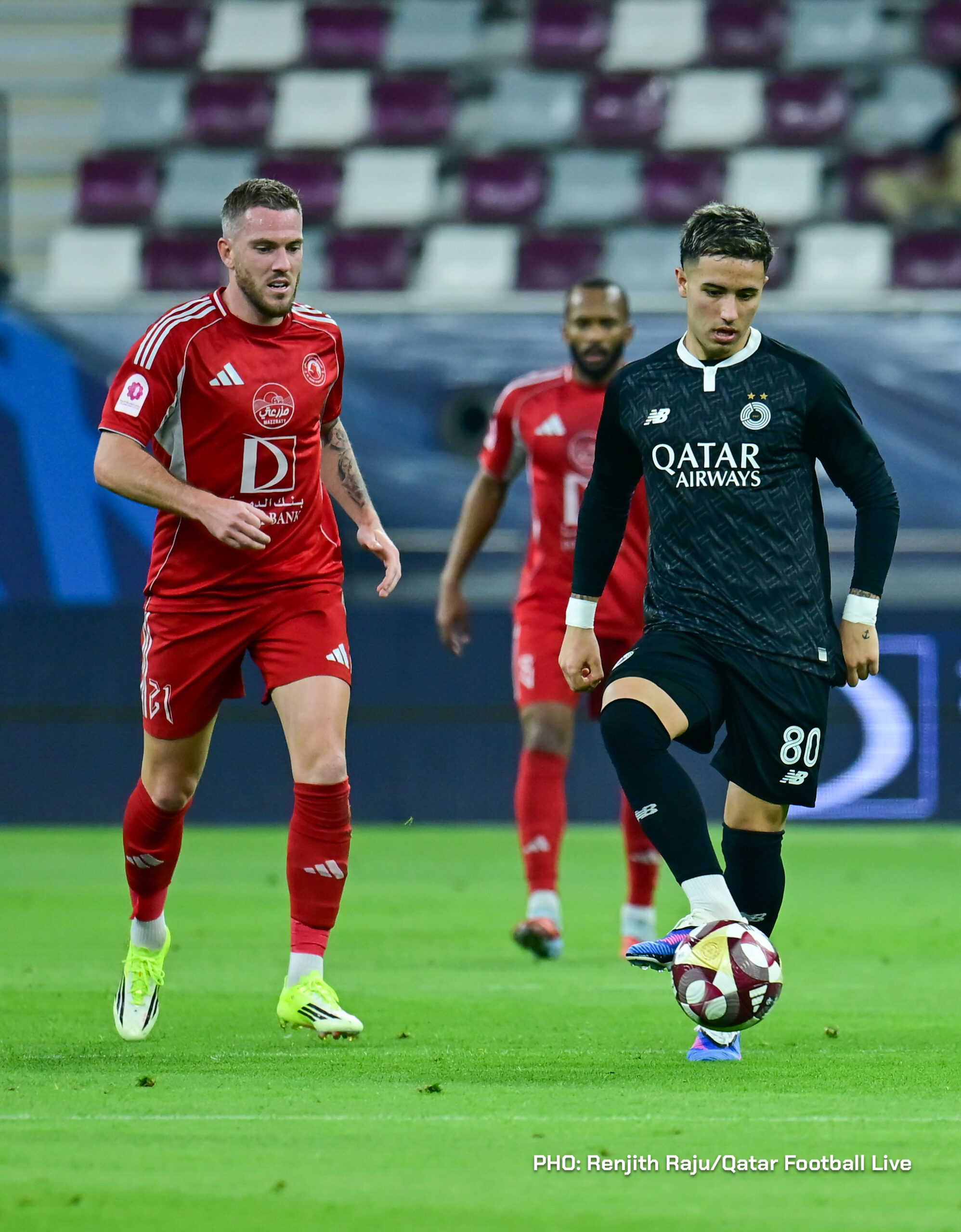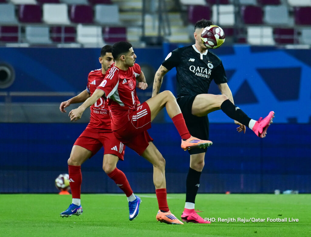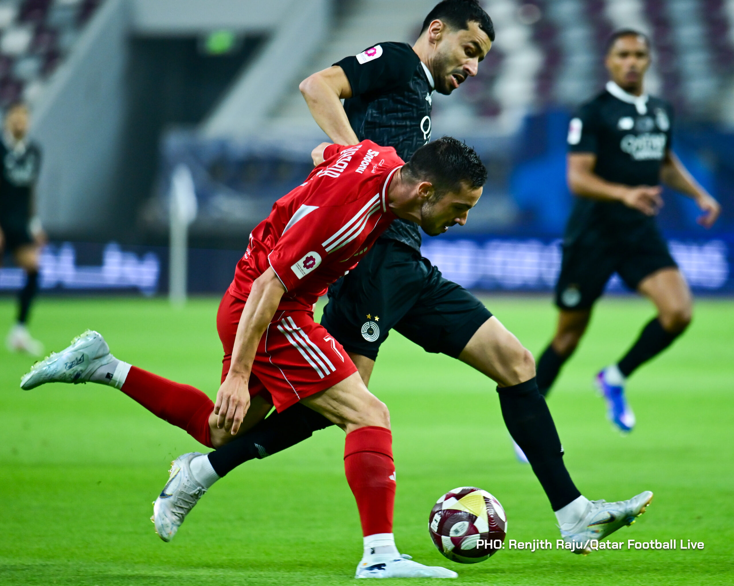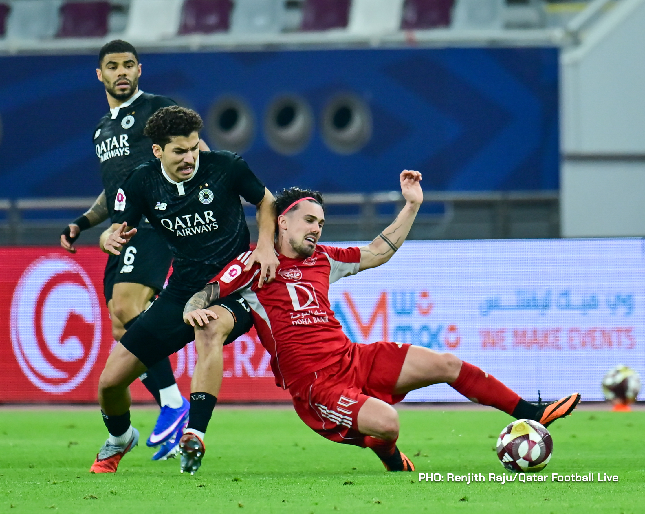Paulo Silva (#6), Anas Abweny (#15) of Al Sadd SC and Rodriguez Sanchez (#10) of Al Arabi SC in action during the match between Al Arabi SC and Al Sadd SC in the week 19 of the Doha Bank Stars League 2025-26 played at Khalifa International Stadium Doha, Qatar on 17 March, 2026. (Photo by Renjith Raju/QFootLive)