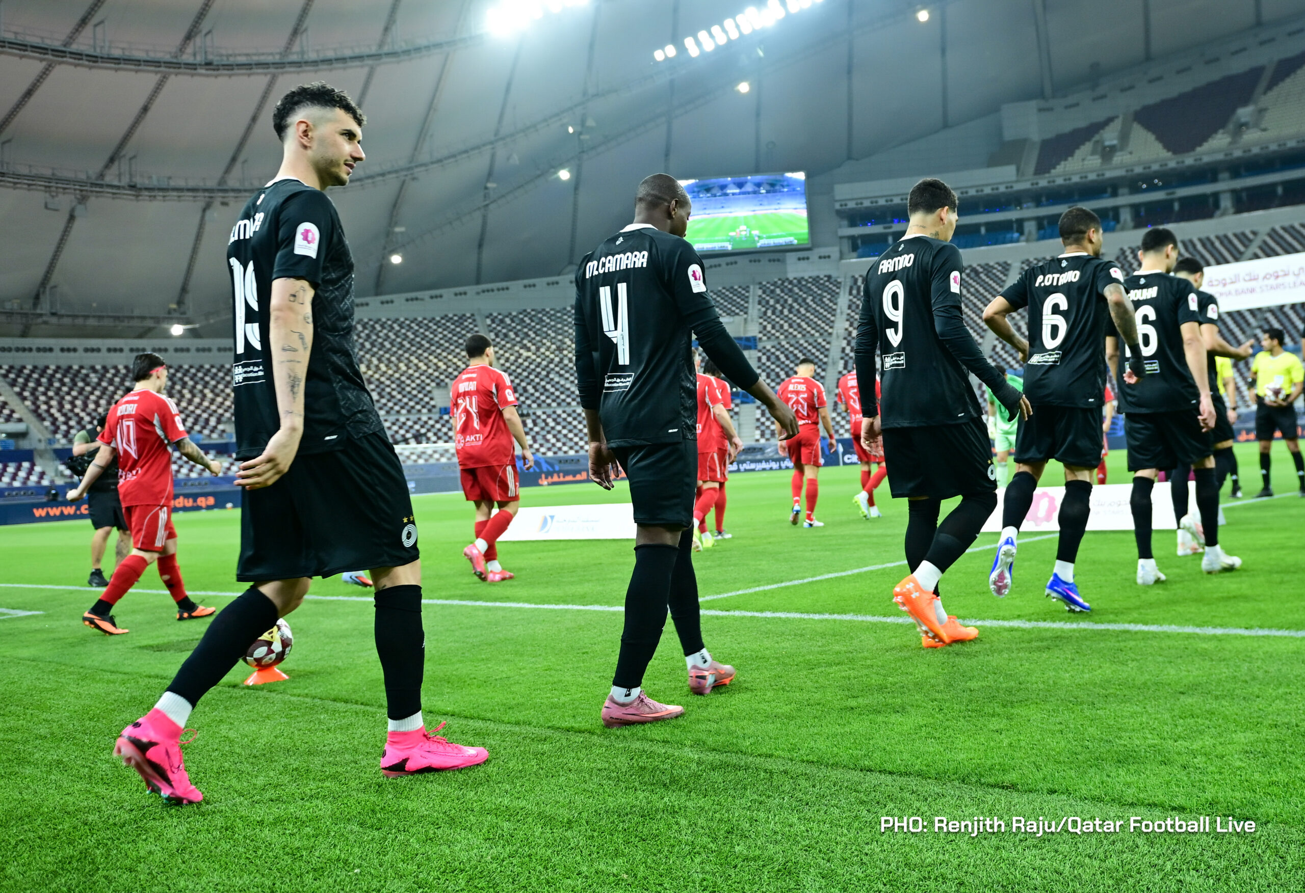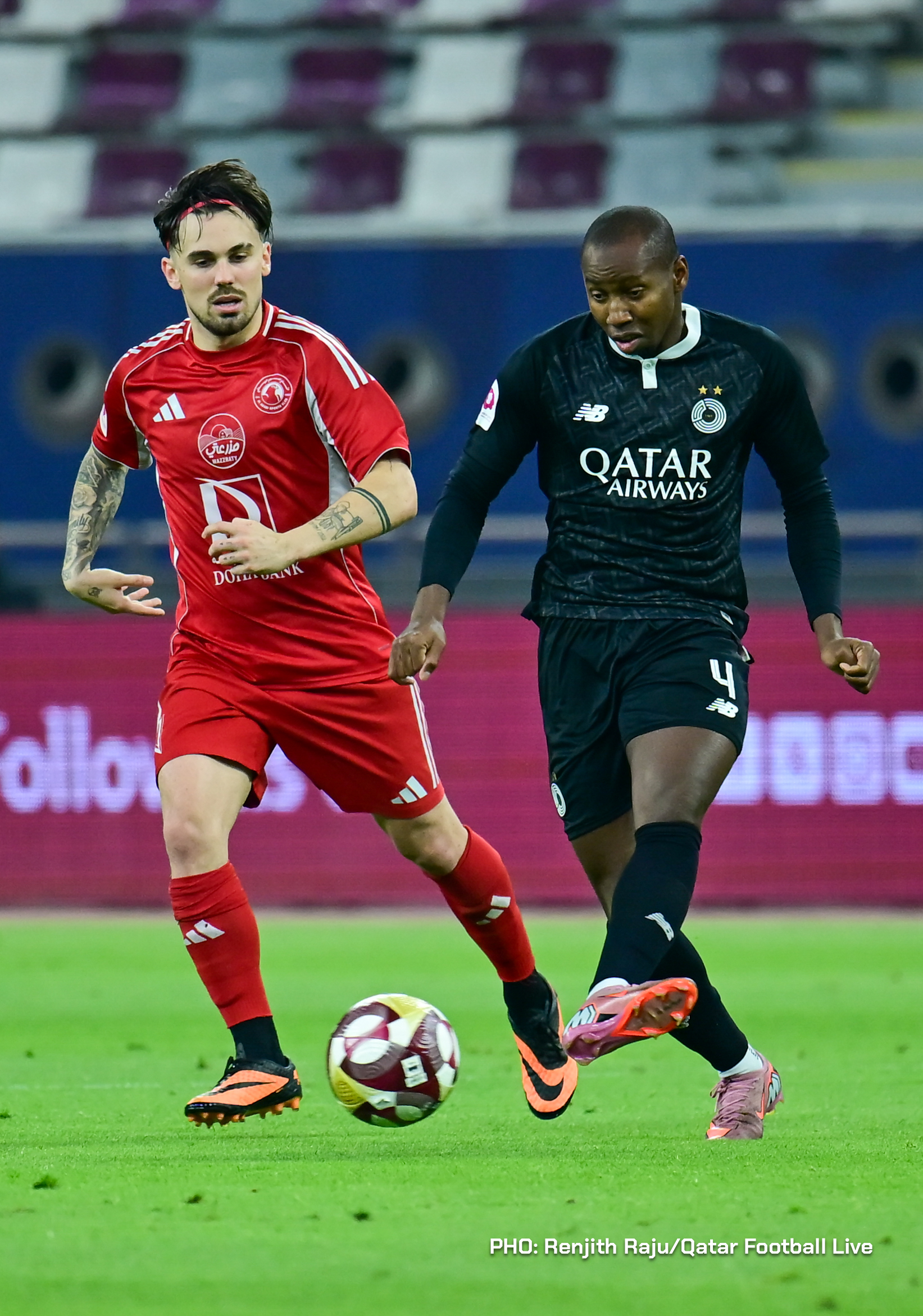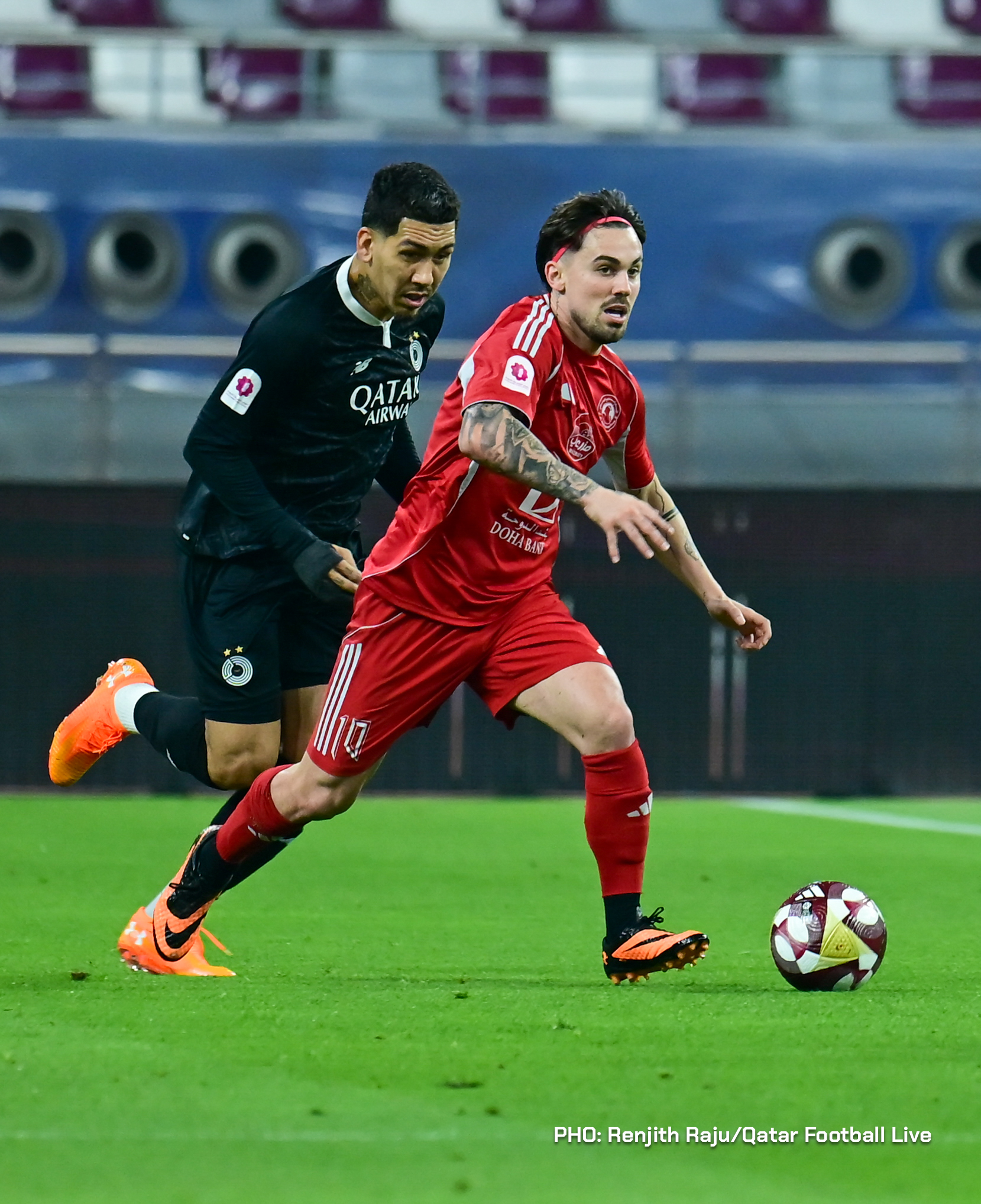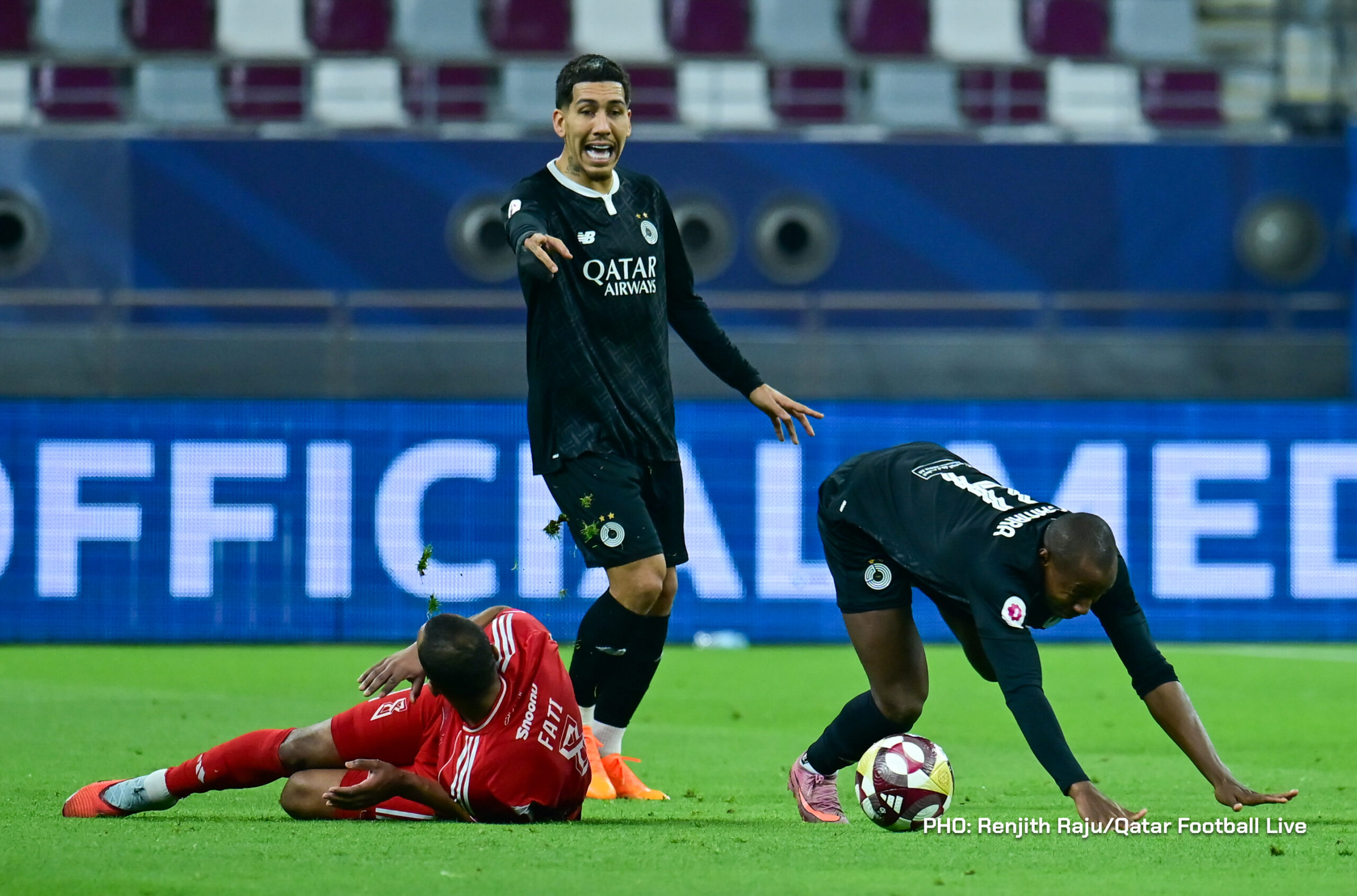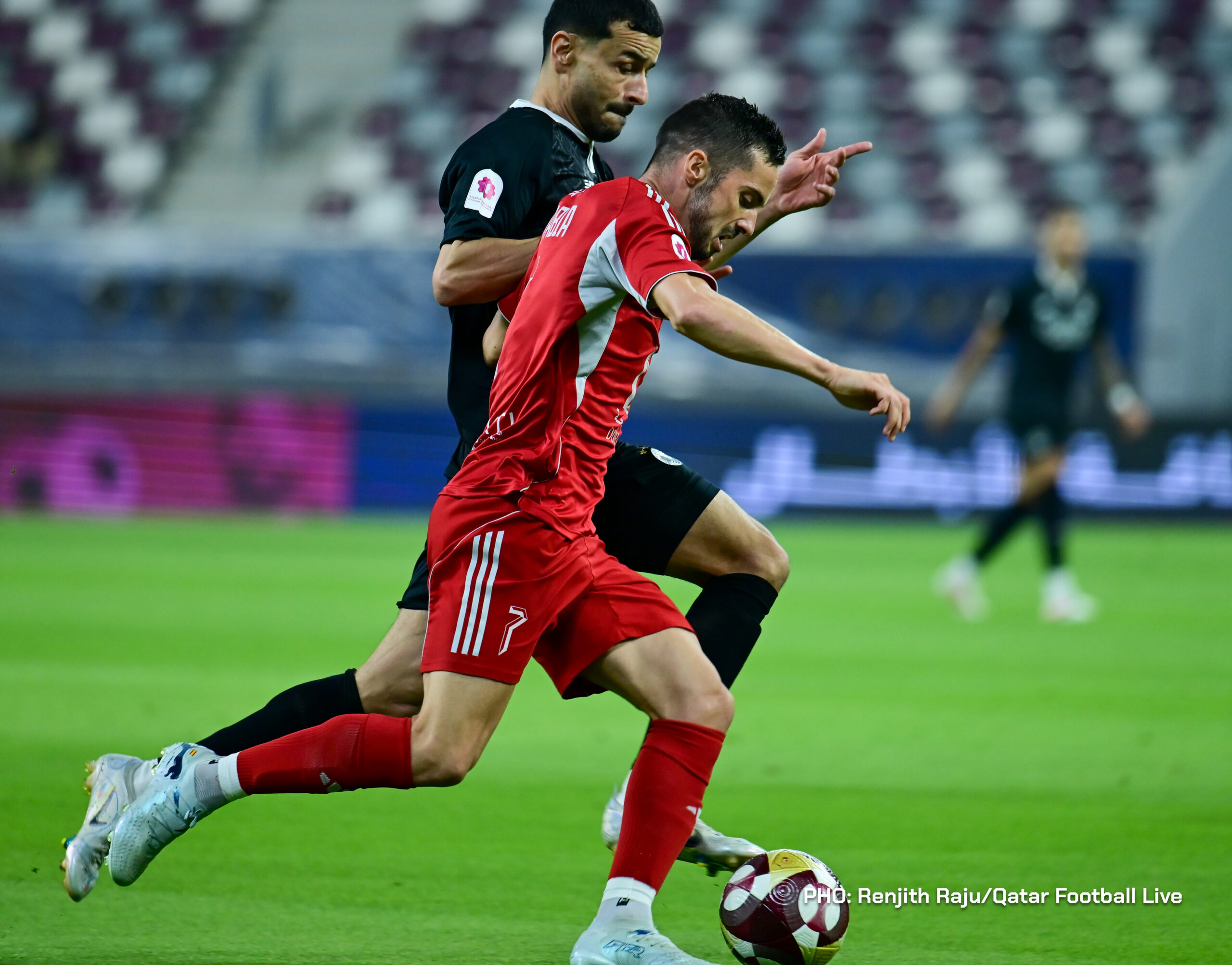 Paulo Silva (#6), Anas Abweny (#15) of Al Sadd SC and Rodriguez Sanchez (#10) of Al Arabi SC in action during the match between Al Arabi SC and Al Sadd SC in the week 19 of the Doha Bank Stars League 2025-26 played at Khalifa International Stadium Doha, Qatar on 17 March, 2026. (Photo by Renjith Raju/QFootLive)