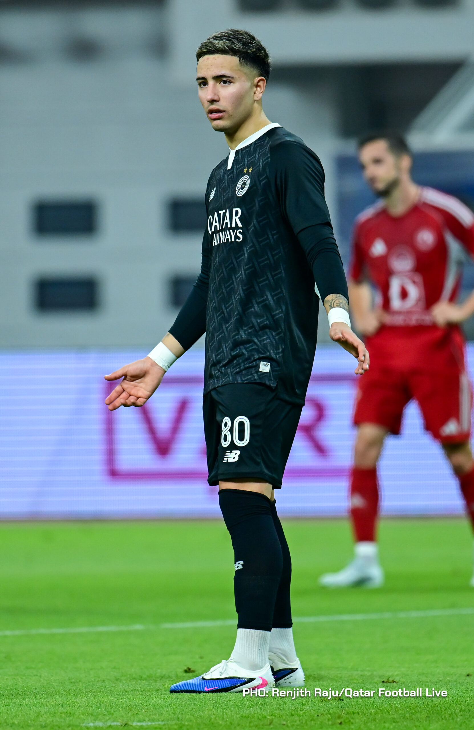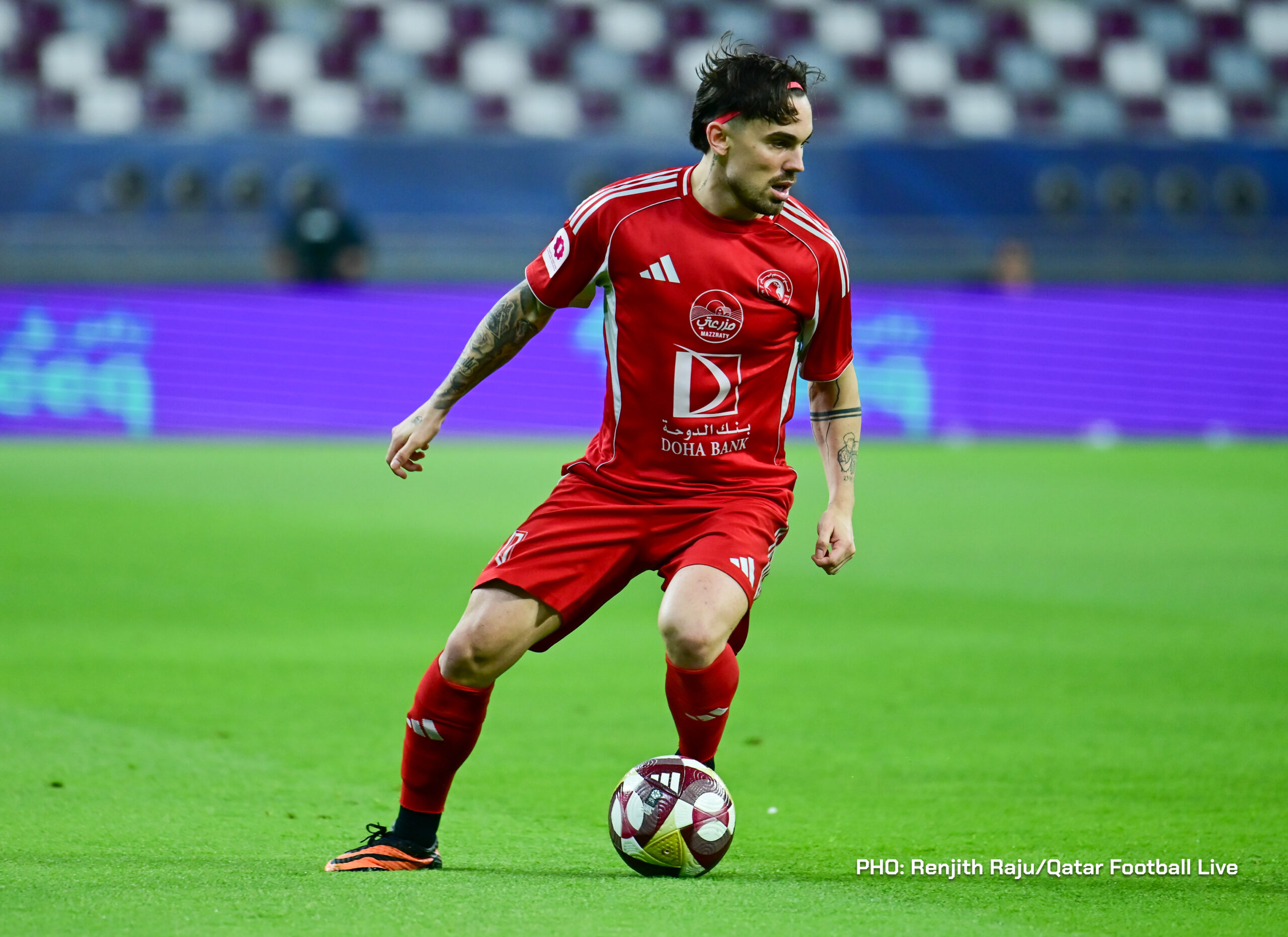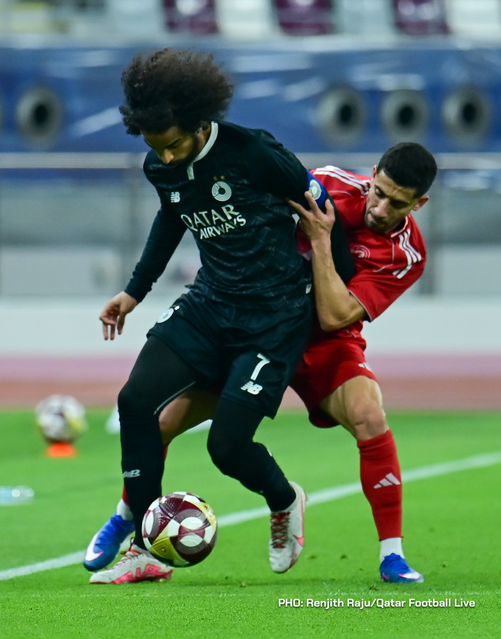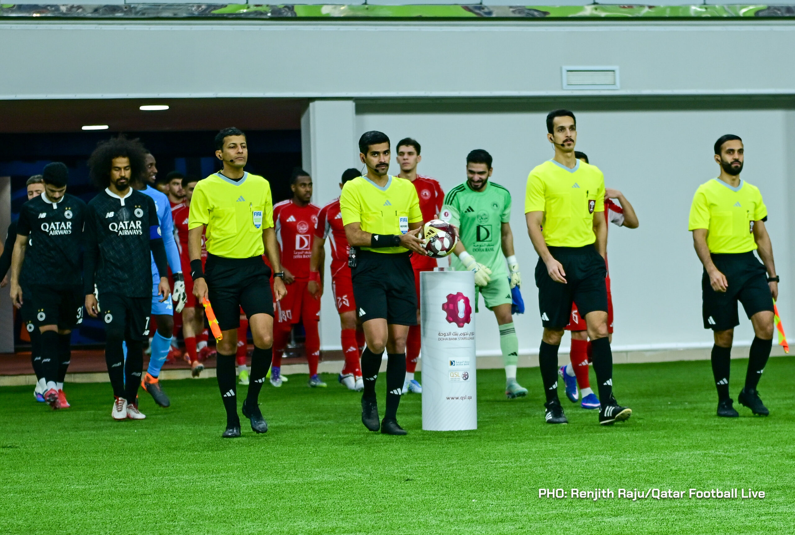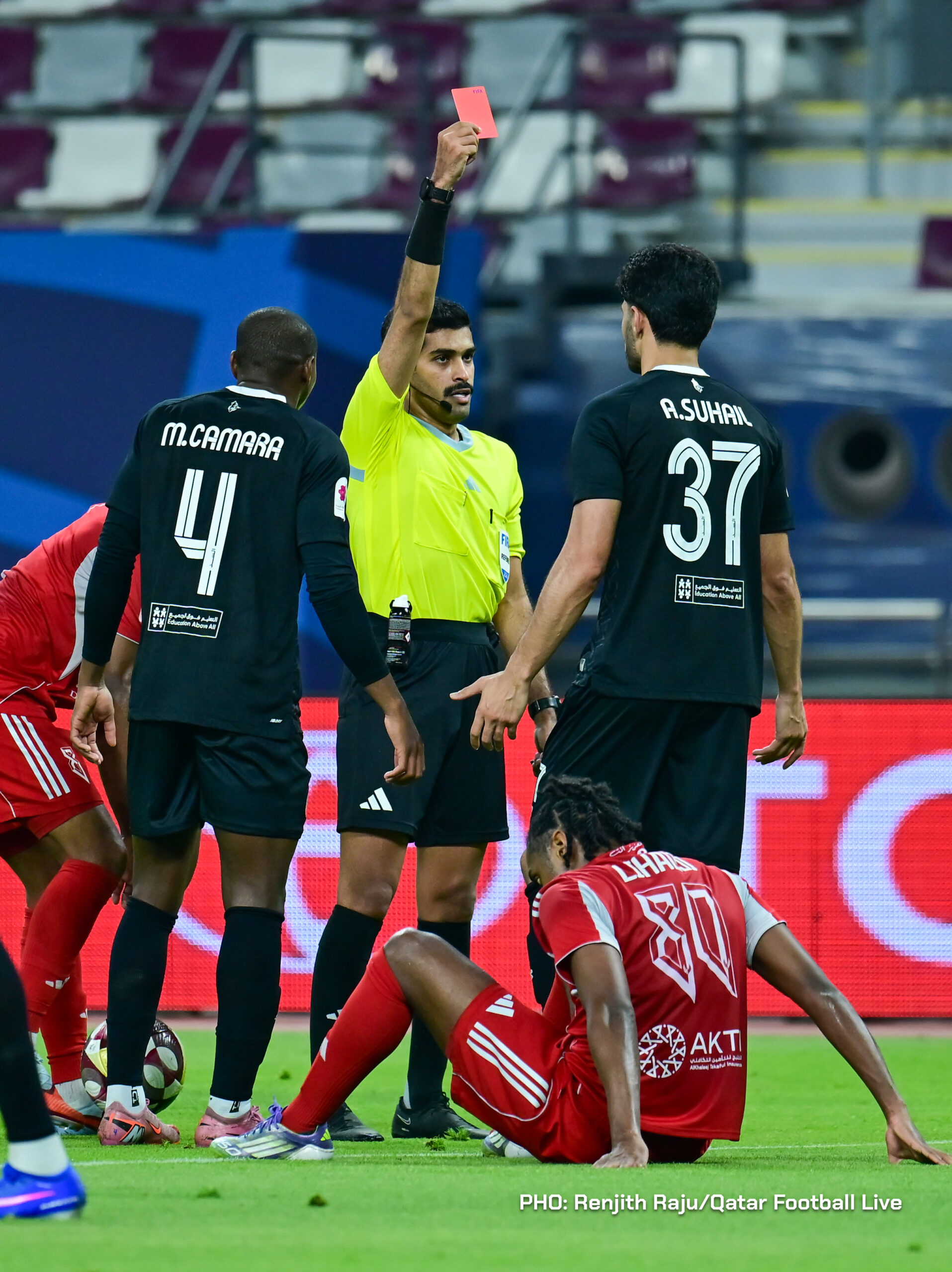 Paulo Silva (#6), Anas Abweny (#15) of Al Sadd SC and Rodriguez Sanchez (#10) of Al Arabi SC in action during the match between Al Arabi SC and Al Sadd SC in the week 19 of the Doha Bank Stars League 2025-26 played at Khalifa International Stadium Doha, Qatar on 17 March, 2026. (Photo by Renjith Raju/QFootLive)